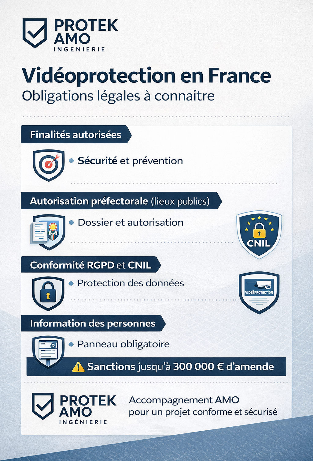 Protek AMO Ingénierie, spécialiste de l’assistance à maîtrise d’ouvrage, accompagne les maîtres d’ouvrage publics et privés afin de garantir des projets de vidéoprotection à la fois efficaces, proportionnés et pleinement conformes.